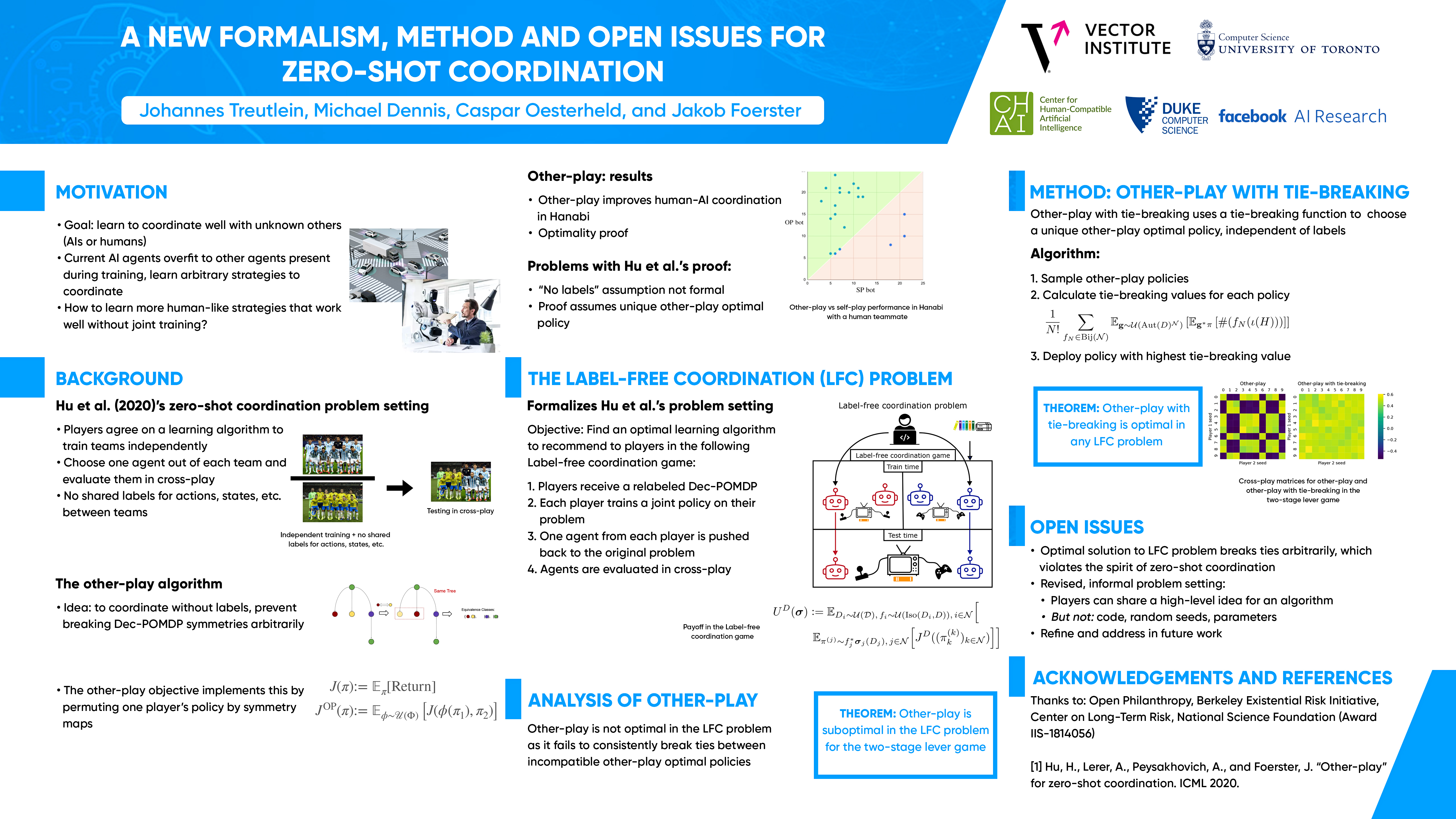 Johannes Treutlein, Michael Dennis, Caspar Oesterheld, and Jakob Foerster. A New Formalism, Method and Open Issues for Zero-Shot Coordination. ICML 2021. [Poster, Video, Code]